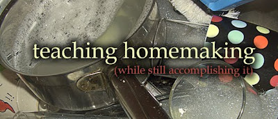 - She can learn to be kind. Okay, this isn’t exactly a chore, but with a little toddling sister around, E definitely has to “share” sometimes. I try mostly to let them sort things out on their own–making sure E doesn’t take advantage of her size, or get too upset when R is being rude (as ten-month-olds are apt to be). I encourage sharing when I can, rather than forcing it. “E, I think R wants to play with the doll.” Nine times out of ten, E will happily hand it over at the mere suggestion, and the other time I figure–well, adults don’t want to share all their toys all the time, either. I’m trying to impart a pattern of selflessness, generosity, and wise decision-making, rather than a simple obedient slave mentality. Another, more chore-related way we try to teach kindness to E is by encouraging her to “help” R with her chores. If R makes a mess, E can help clean it up. (It helps that E loves to clean and would clean up her parents’ messes if she could!)
